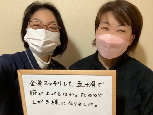 ずっと五十肩に悩まれて、評判の良かった遠方の整骨院にしばらく通院。施術を受けた日は軽くなるものの翌日にはまた戻ってしまうを繰り返していました。